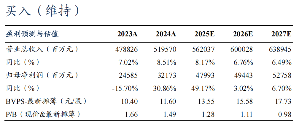 盈利预测与投资评级:咱们督察此前盈利预测,瞻望2025-2027年公司归母净利润为480/494/528亿元,刻下市值对应2025E PB 1.3x,督察“买入”评级。